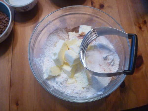 In a large bowl sift all dry ingredients together. Cut up your butter, I used cold because I was not sure what to do. Then use a pastry cutter to cut the butter into the dry stuff, until it is all crumbly. Add your cinnamon chips.